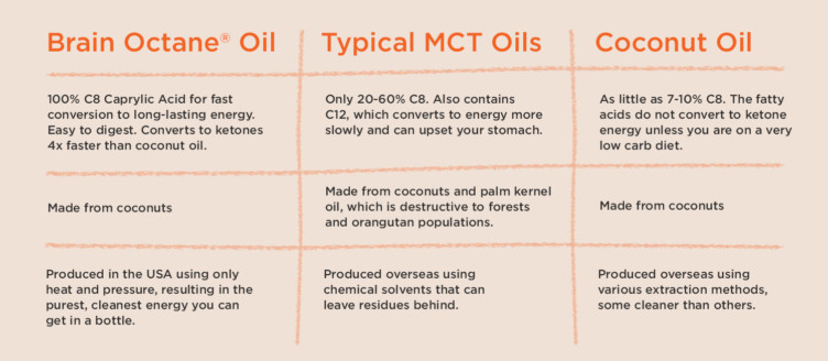 Provides energy all day. Brain Octane Oil is the best MCT oil to efficiently convert to ketone energy in your body, providing lasting fuel without the afternoon crash you get with energy from carbs and sugar.